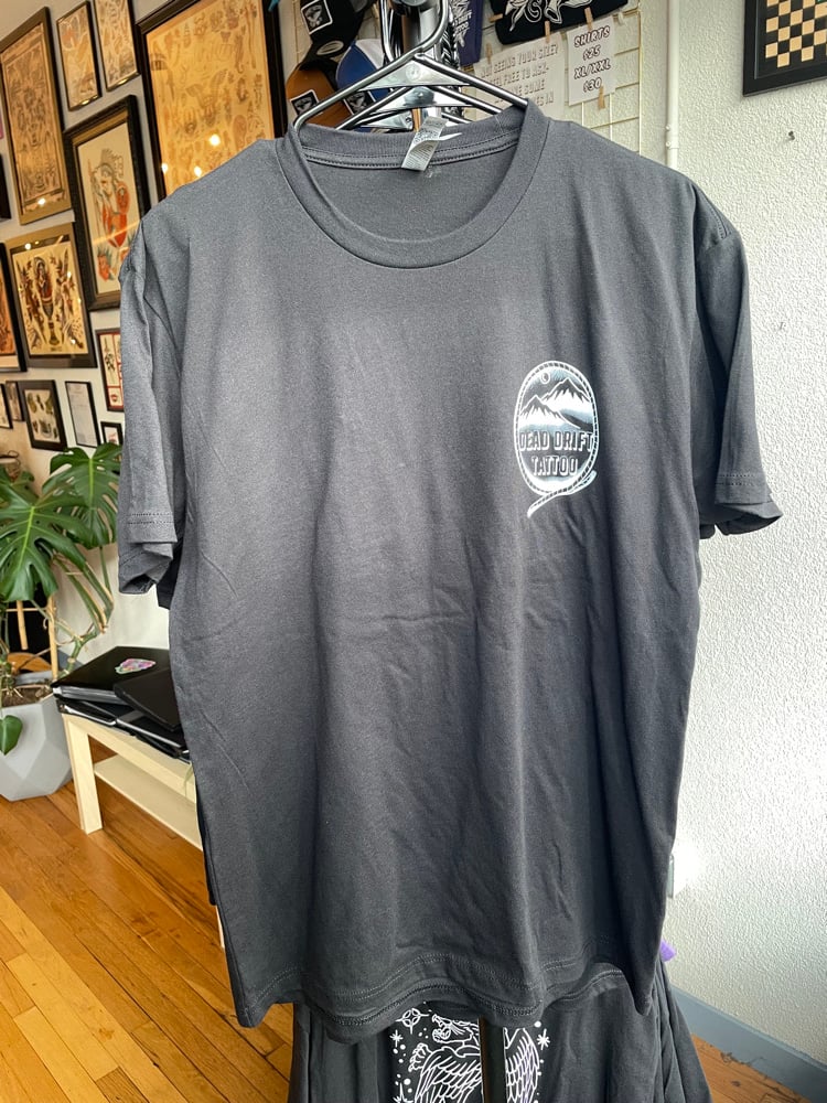 White ink printed on our classic super-soft black Next Level shirts, which are a 60% cotton/40% polyester blend. Front features a mountain scene and the words Dead Drift Tattoo, and the back is a large image of a brown trout with a cowboy hat and the word Denver. Designed by AJ McGuire