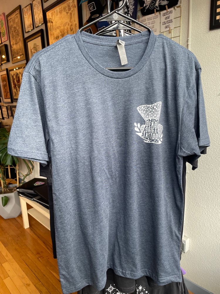 White ink printed on our classic super-soft navy heather Next Level shirts, which are a 60% cotton/40% polyester blend. Front features a trout tail and the words Dead Drift Tattoo, and the back is a large image of a tattooed trout and the words Tight Lines. Designed by AJ McGuire